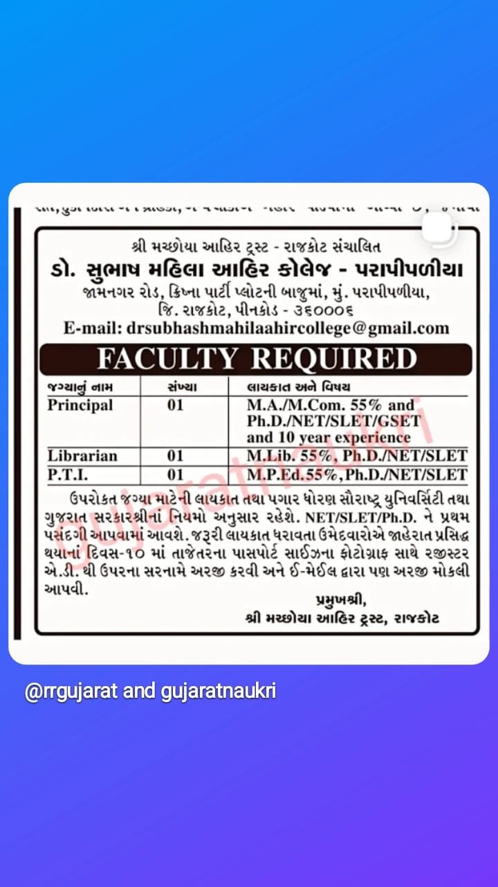 શ્રી મચ્છોયા આહિર ટ્રસ્ટ દ્વારા સંચાલિત ડો. સુભાષ મહિલા આહિર કોલેજમાં પ્રિન્સિપાલ, લાઇબ્રેરિયન અને પી.ટી.આઇ.ની જગ્યાઓ માટે ભરતીની જાહેરાત એ શિક્ષણ ક્ષેત્રમાં કારકિર્દી બનાવવા માગતા લોકો માટે એક સુંદર તક છે. જો તમારી પાસે જરૂરી લાયકાત છે, તો સમયસીમાની અંદર અરજી કરવી જોઈએ. યાદ રાખો કે નેટ/એસએલઇટી/પીએચ.ડી. ધરાવતા ઉમેદવારોને પ્રાધાન્ય મળશે. આ ભરતીમાં ભાગ લઈને તમે શિક્ષણના ક્ષેત્રમાં તમારો મૂલ્યવાન ફાળો આપી શકો છો અને સમાજના વિકાસમાં ભાગ લઈ શકો છો.