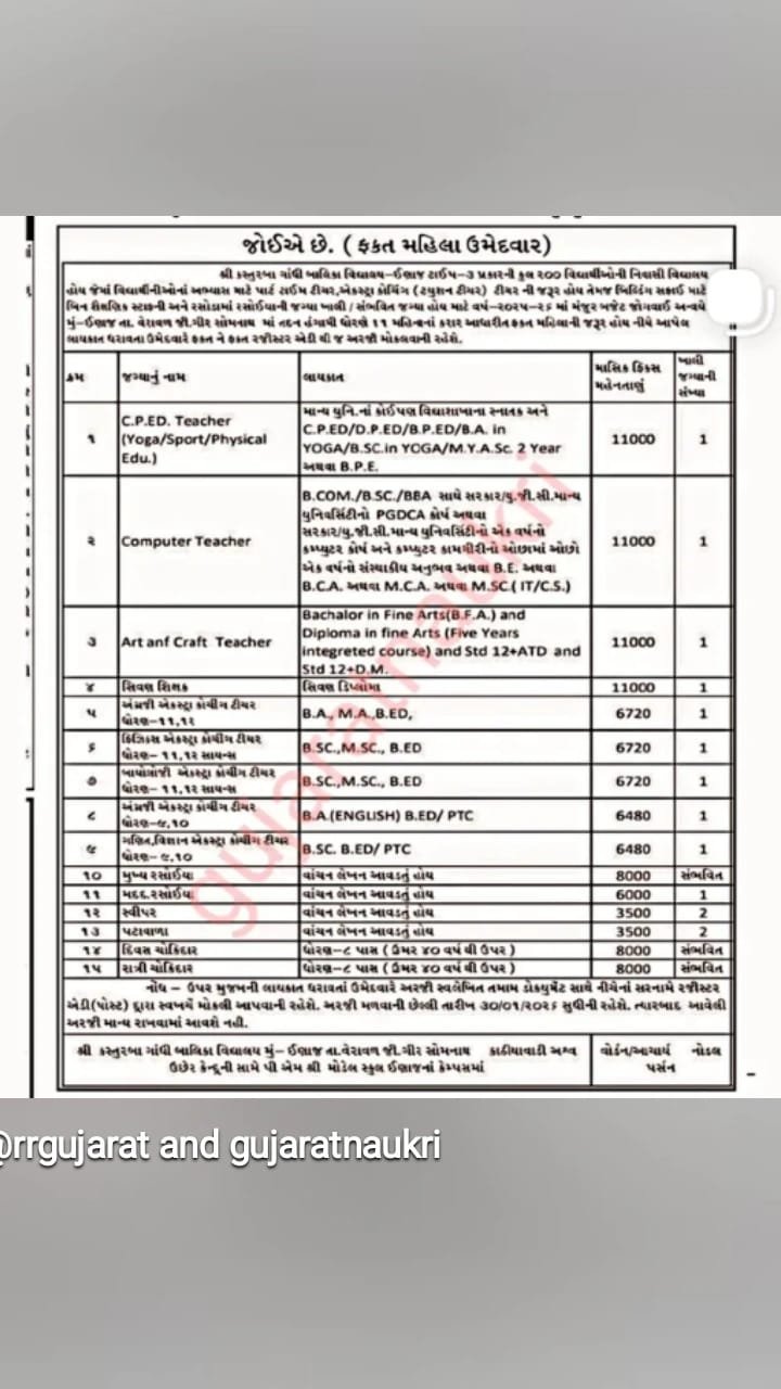એક્સ્ટ્રા કોચિંગ શિક્ષક (ગણિત, રસાયણ, જીવવિજ્ઞાન, અંગ્રેજી, ગણિત-વિજ્ઞાન)સંબંધિત વિષયમાં B.Sc./B.A. + B.Ed. અથવા PTC.ધોરણ ૧૦-૧૨ ની વિદ્યાર્થીનીઓને વધારાની અભ્યાસ સહાય.6,480 થી 6,720 રૂપિયા